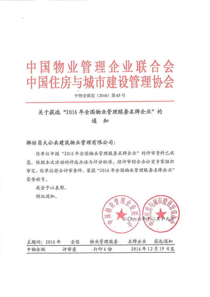 2016年度全國(guó)物業(yè)管理服務(wù)名牌企業(yè)
