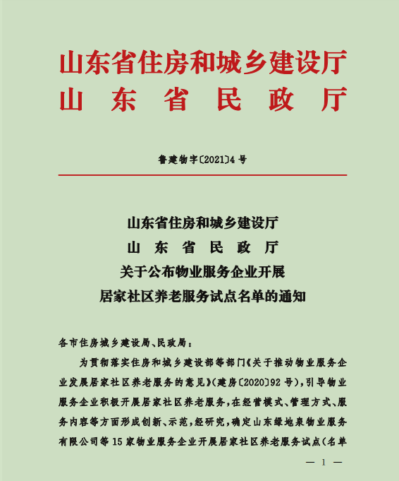 2021年9月6日,山東省住房和城鄉(xiāng)建設廳、山東省民政廳聯合公布了關于物業(yè)服務企業(yè)開展居家社區(qū)養(yǎng)老服務試點名單,我公司在首批試點名單之列。 ......