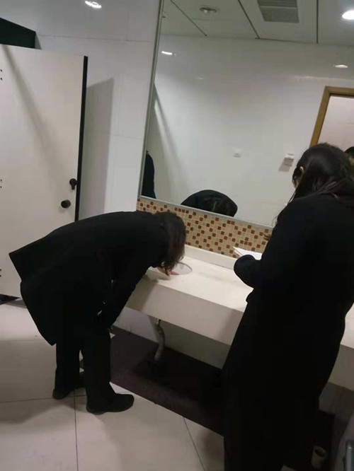 以下圖片是各場(chǎng)館衛(wèi)生負(fù)責(zé)人及保潔主管認(rèn)真檢查記錄各場(chǎng)館的衛(wèi)生并相互交流工作心得的圖片介紹: